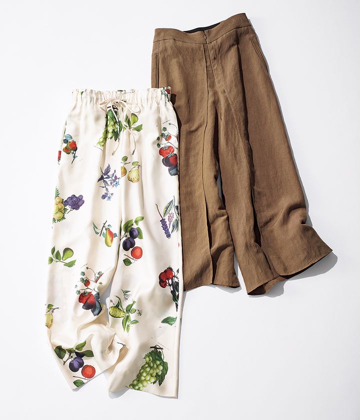 プリントのキャバンの1本は、華やかなフルーツ柄が可愛い。18~19世紀の植物図鑑から、1つ1つ選んで組み合わせたそう。シルクだから、涼しくてそしてエレガント。どちらもウエストが、ゴムやドローストリング仕様なので、嫌な締め付け感とも無縁です。