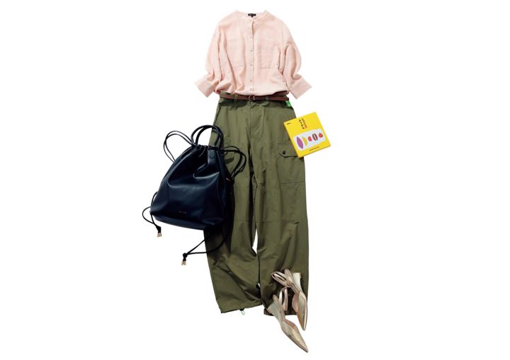 ブラウス¥15,950/インディヴィ、カーゴパンツ¥11,000/デッサン(ともにワールド) リュック¥17,600/Stola. ウェッジヒールパンプス¥17, 600/ダイアナ(ダイアナ 銀座本店) ベルト¥1,290/GU