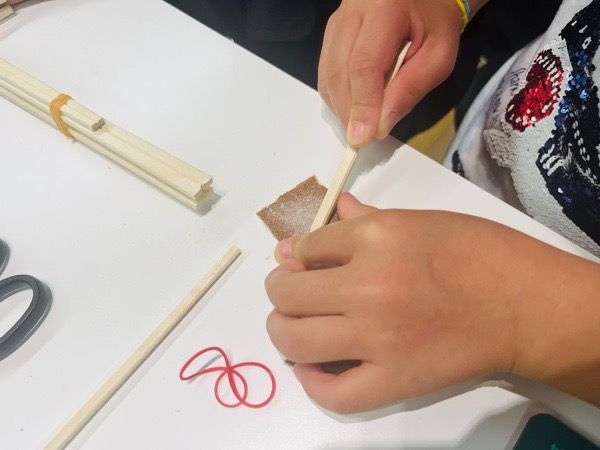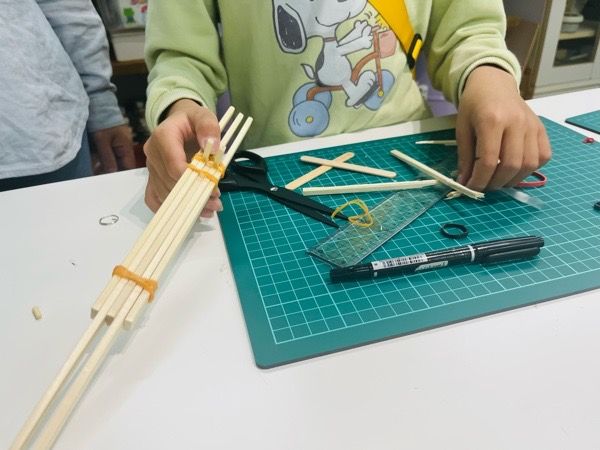 途中、「輪ゴム銃も作りたい」と、その時にある材料の中から同時並行で銃も作っていく子ども達。