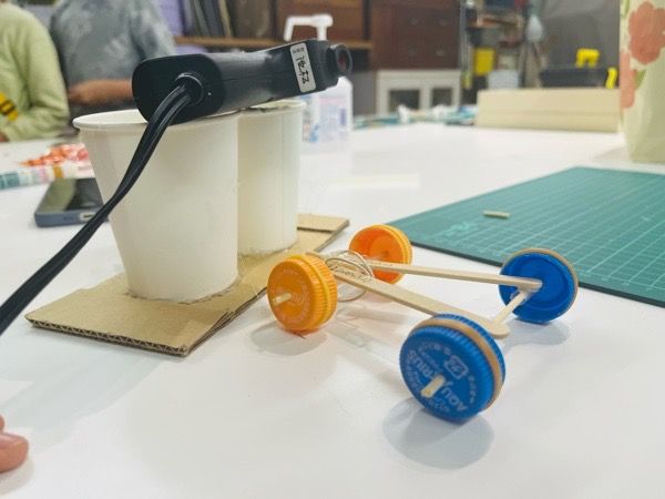 講師がこの日制作用に準備していたのは、輪ゴムの力で走る車。グルーガンも使って、仕上げます。