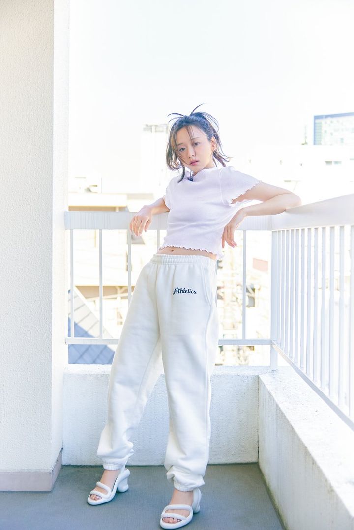 空港コーデとしても注目を集めるラフスウェットには、クロップド丈の女っぽTシャツを合わせることで、レディみをプラス。