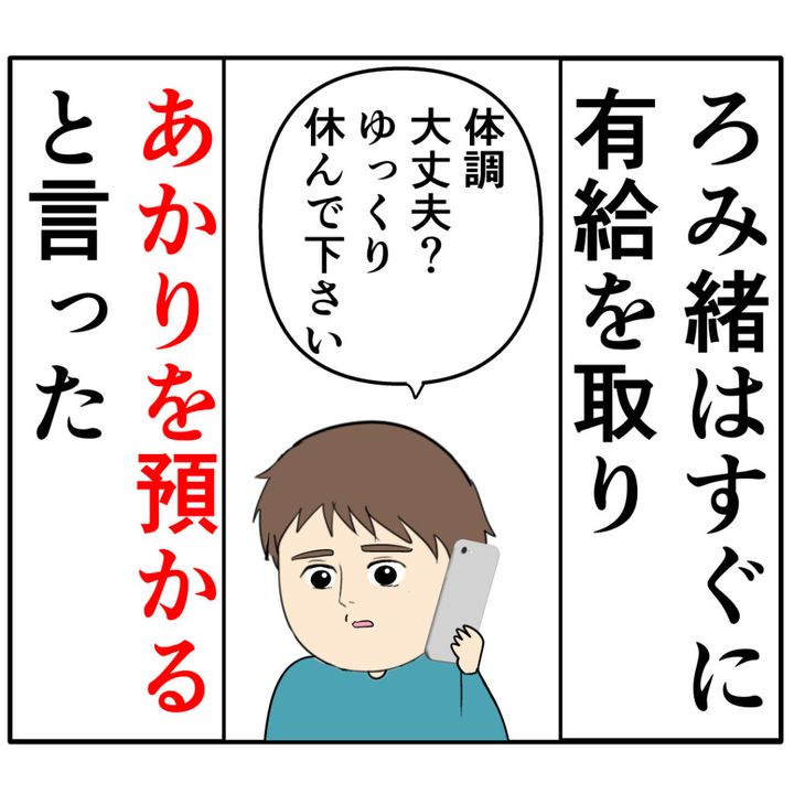 連絡するとろみ緒さんはすぐに有休を取ってあかりちゃんを預かってくれ、「体調大丈夫?ゆっくり休んで下さい」とめいさんを気遣いサポートしてくれました。