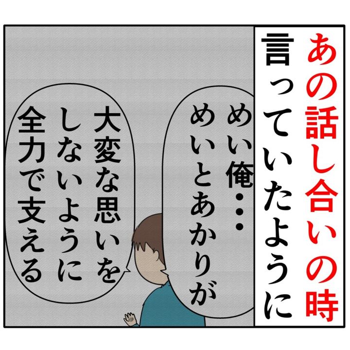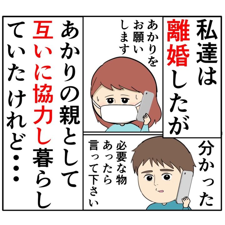 離婚についての話し合いをした際に「何でもする」「めいとあかりが大変な思いをしないように全力で支える」と言っていたろみ緒さん。離婚後のろみ緒さんは、その言葉通りめいさんとあかりちゃんを全力でサポートしてくれました。金銭面のサポートはもちろん、めいさんとめいさんの両親が揃って体調を崩してしまったときには、すぐに仕事を休んであかりちゃんを預かると申し出てくれるなど行動でもサポートしてくれました。離婚はしたものの、めいさんとろみ緒さんはあかりちゃんの親としてお互いに協力して暮らしていました。