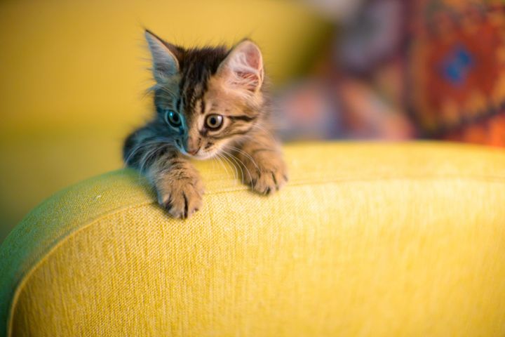 Adorable Kitten Peeking Over Yellow Couch