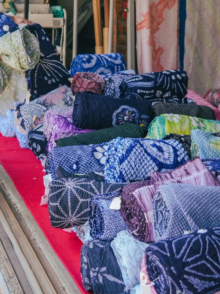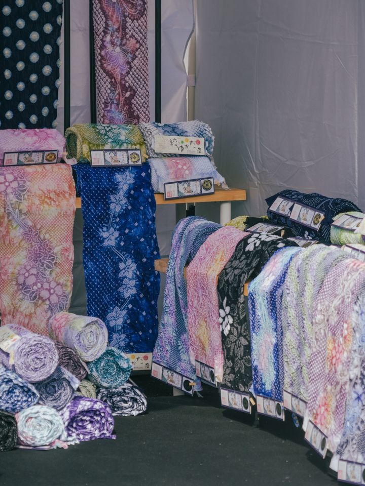 既存の店舗やポップアップのお店も多く出店され、絞りの反物が並びます✨このお祭りのために様々な柄や色の反物が取り揃えられているので、お気に入りが見つかるはず!