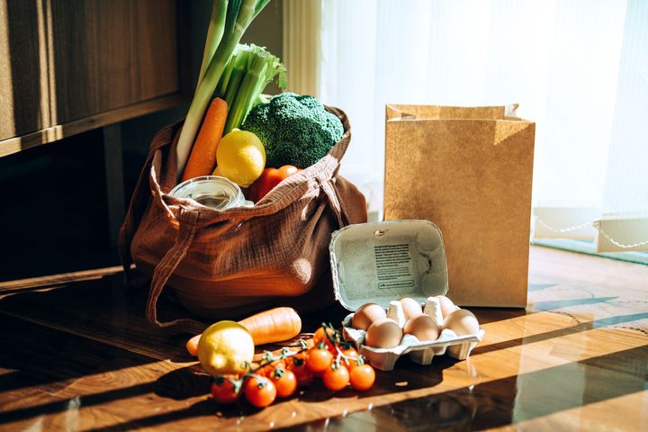 Eco-friendly reusable shopping bag with multi-coloured fresh vegetables and groceries at home. Shopping with reusable grocery bag for plastic free and waste-free life. Responsible shopping. Zero waste food shopping and sustainable lifestyle concept