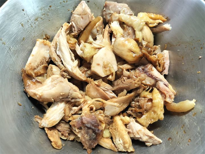 9. 鶏肉を縦に細かく刻んで、8に入れて混ぜます。
