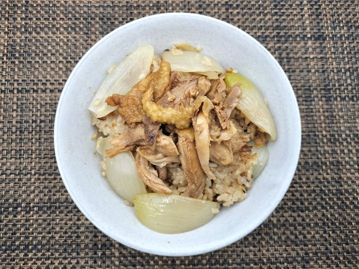 材料はとてもシンプルですが、しょうゆベースの和風の味に鶏肉の旨味と玉ねぎの甘味が加わって、鶏の脂でつやつやとしたご飯だけ食べても、ちゃんと旨味を感じ取ることができます。そこにタレをつけた鶏肉を乗せて食べてみると、タレだけで舐めると強すぎるのに、不思議とちょうどよいおいしい味わいになっていました。