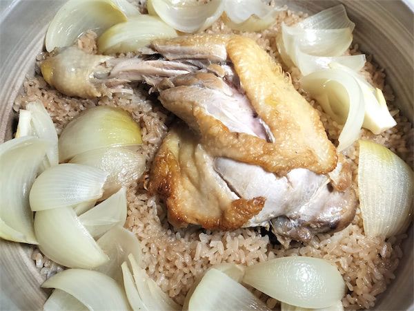 3. 【『美味しんぼ』の再現レシピ】使うのは玉ねぎと鶏もも肉だけ!土鍋でご馳走「タマネギの釜飯」炊こう!