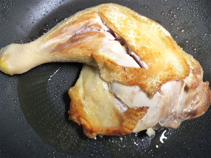 2. フライパンにオリーブオイル(適量・分量外)をひいて中火にかけ、鶏肉を皮目を下にして入れます。