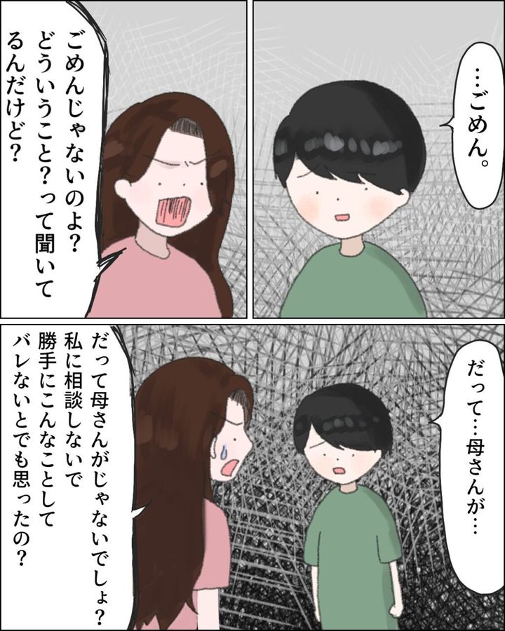 「どういうこと!?」と聞いても「・・ごめん」と謝るだけで理由を言わない良太に「ごめんじゃないのよ?どういうこと?って聞いてるんだけど?」とさらに問い詰めると、「だって・・母さんが・・」と口にした良太。「だって母さんがじゃないでしょ?私に相談しないで勝手にこんなことしてバレないとでも思ったの?」良太の情けなさに呆れながらそう言うと、