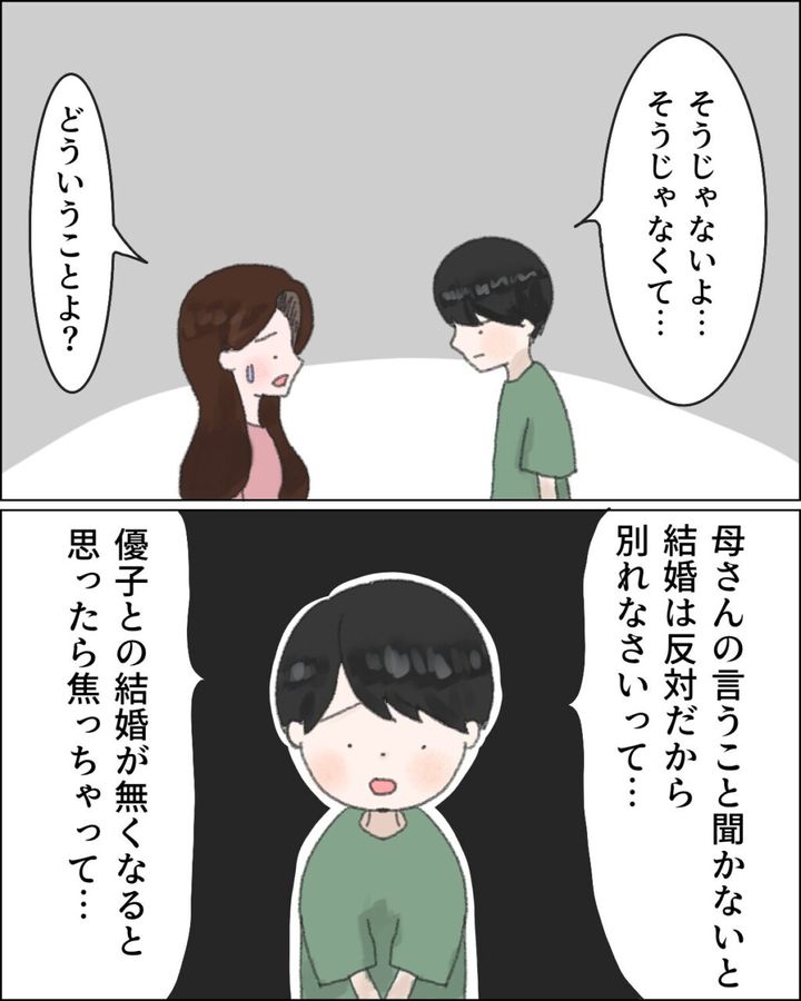 「そうじゃないよ・・そうじゃなくて・・」と言いにくそうな良太に「どういうことよ?」と聞き返すと、「母さんの言うこと聞かないと結婚は反対だから別れなさいって・・。優子との結婚が無くなると思ったら焦っちゃって・・」と、勝手にプラン変更した理由をしゅんとしながら話した良太。