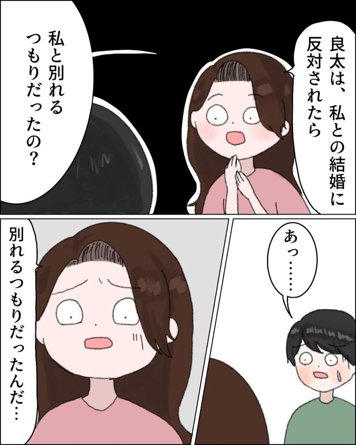 優子さんに内緒で結婚式の内容を義母の要望通りに変更しようとしていた良太さん。優子さんに問い詰められた良太さんは「母さんの言うこと聞かないと結婚は反対だから別れなさいって・・」と母親から言われたことを打ち明け、優子さんとの結婚が無くなるのが嫌で義母の要望通りにプラン変更したと話しました。「優子と別れるのはイヤだったから・・」と言う良太さんに深い愛を感じキュンとしかけた優子さんでしたが、ふとある疑問が浮かび瞬時に冷静になりました。母親が別れなさいと言ったら本当にその通りにするつもりだったのかと疑問に思った優子さんが「良太は、結婚に反対されたら私と別れるつもりだったの?」と聞くと、良太さんは言葉に詰まってしまいます。「そんなわけない」と即否定してくれることを期待していた優子さんはショックを受けます。