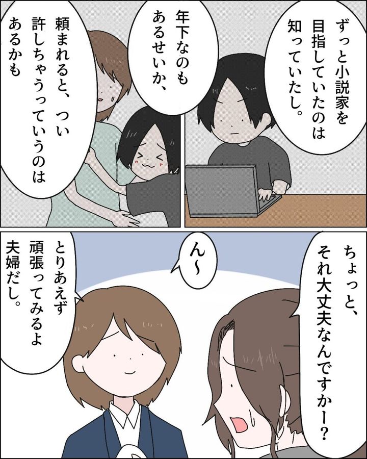 私、フミヤに甘いのかな。フミヤがずっと小説家を目指していたのは知っていたし、年下ということもあるのか、頼まれるとつい許しちゃうのは確かにあるかも。「ちょっと、それ大丈夫なんですかー?」とカナちゃんは「ありえない」と言いたげな顔。でもとりあえず夫婦だから頑張ってみると答えました。
