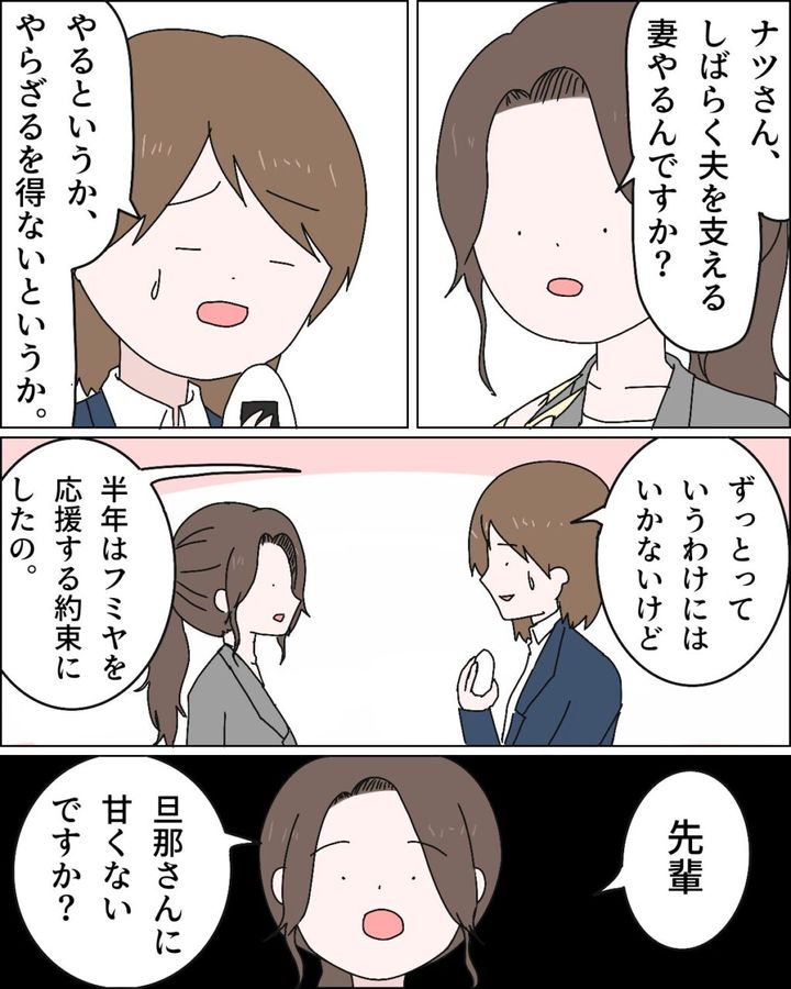 夫の夢を支える妻を、とりあえず半年間はやらざるを得なくなったという私に、カナちゃんは「先輩、旦那さんに甘くないですか?」とズバリ。