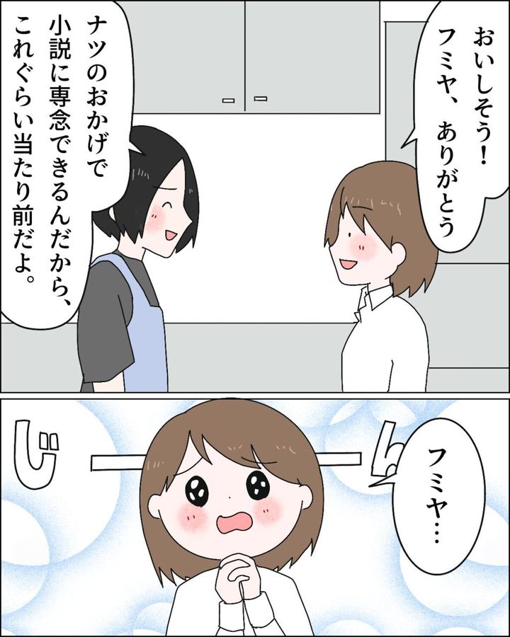 「美味しそう。フミヤありがとう。」という私にフミヤは「ナツのおかげで小説に専念できるんだから、これぐらい当たり前だよ。」と言ってくれたので、私は感動してしまいました。