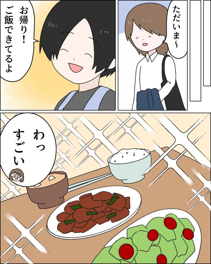 帰宅すると、「お帰り!ご飯できてるよ!」と笑顔のフミヤが迎えてくれました。食卓には出来立ての夕飯が並んでいます。「わっすごい」と思わず目を丸くしてしまいました。