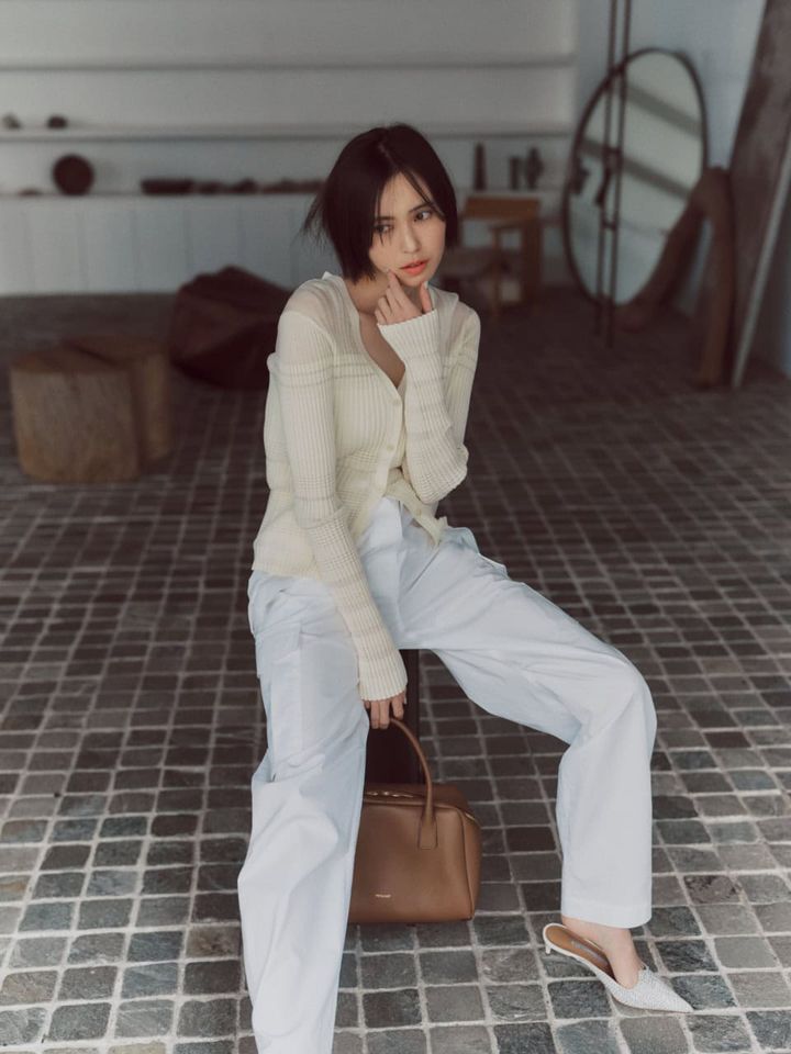 カーディガン¥39,600、パンツ¥39,600(共にセオリー/リンク・セオリー・ジャパン)、バッグ¥158,400(フランツロアー/ドゥーズィエム クラス 青山店)、シューズ¥69,300(ペリーコ/アマン)