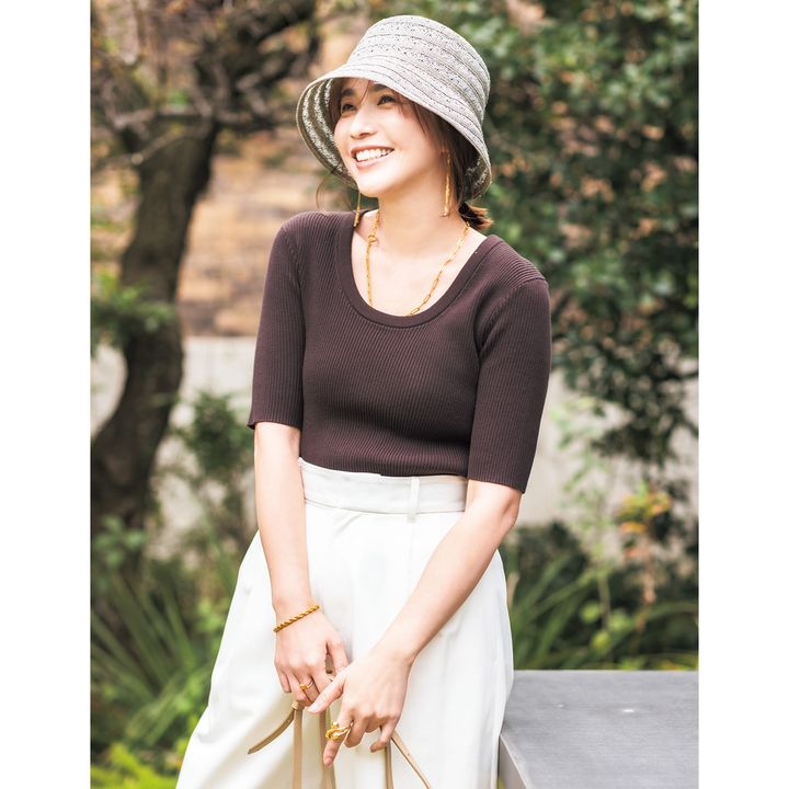 バケットハット¥19,800(メゾンドリリス)ニット¥6,600(Mila Owen/Mila Owen ルミネ新宿2店)パンツ¥8,990(アンフィーロ/オンワード樫山)バッグ¥126,500(J&M デヴィッドソン/J&M デヴィッドソン カスタマーセンター)ピアス¥94,600(ココシュニック)ネックレス¥18,700(ココシュニック オンキッチュ/ココシュニック)ブレスレット¥3,630〈ヘンカ〉リング[左手]¥45,100〈mysha〉リング[右手]¥24,200〈CAKI〉(すべてロードス)