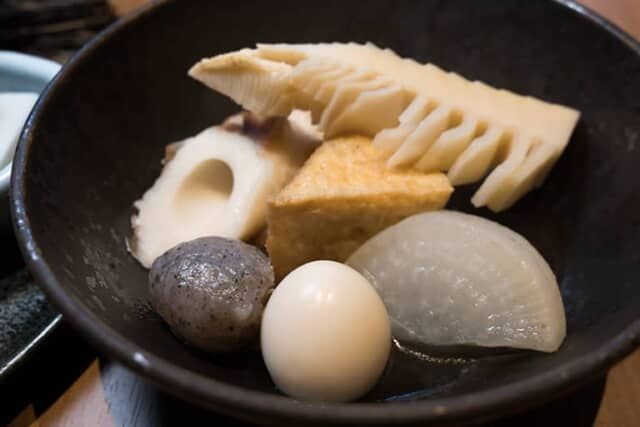 思いのほか市内のお店で定番化している京都のおでん。鴨料理のお店も目にする京都だけに、鴨ガラの出汁で煮込んだ京厚揚げや大根などを、ぜひ味わってみてください。