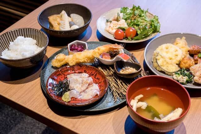 メインプレートは「海老天麩羅と鯛茶漬けお出汁」を選びました。大きな海老の天ぷらや胡麻ダレのかかった鯛の刺身、お浸しや辛子明太子、お茶漬けのトッピングもそろう贅沢なプレートです。