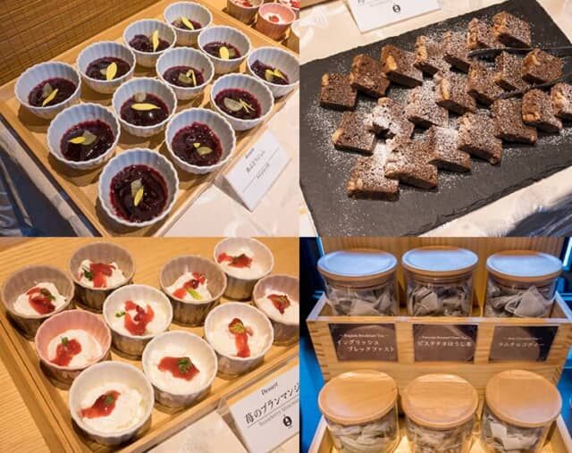 一口サイズのデザートもオシャレ。赤ぶどうのジュレや苺のブランマンジェ、ブラウニーなどが並び、紅茶のティーパックも数種類から選べます。