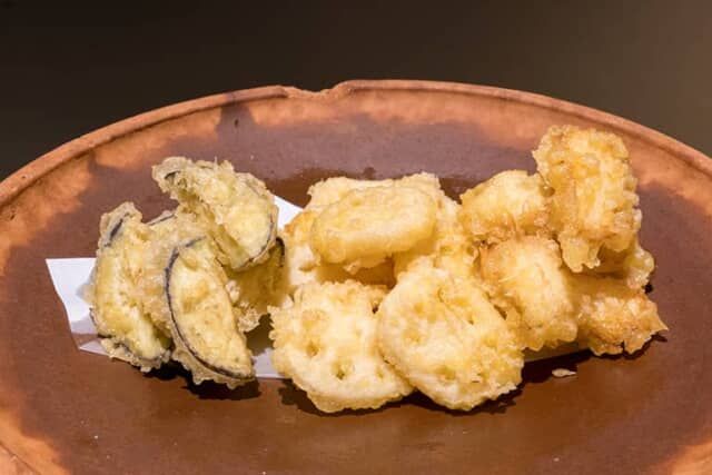 海外からのお客さんにも人気の天ぷらも、毎朝日替わりの具材で揚げています。この日は茄子やレンコンなどで、抹茶塩やほうじ茶塩でいただきます。