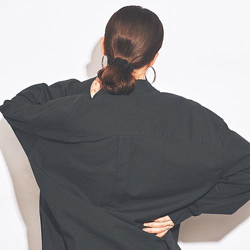 ゆったりとしたシャツをシャープに見せるため、ヘアはおくれ毛なしのタイトに。結び目にアートのようなバレッタを添えたら、仕上げに太めのシルバーピアスで耳元にエッジを効かせて後ろ姿にまで配慮。