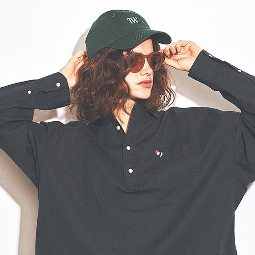 シャツを着くずすように、古着屋にありそうなキャッチーな小物をセレクト。目を引くピアスでシャツの左胸を飾ったら、+グリーンキャップのカラフルな配色の抜けに、穏やかなベージュのサングラスを。