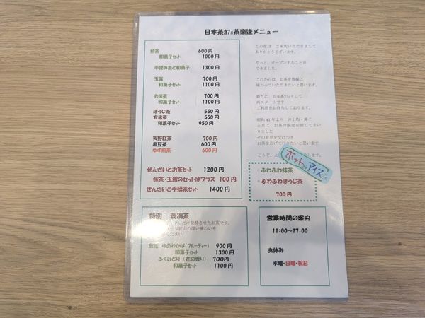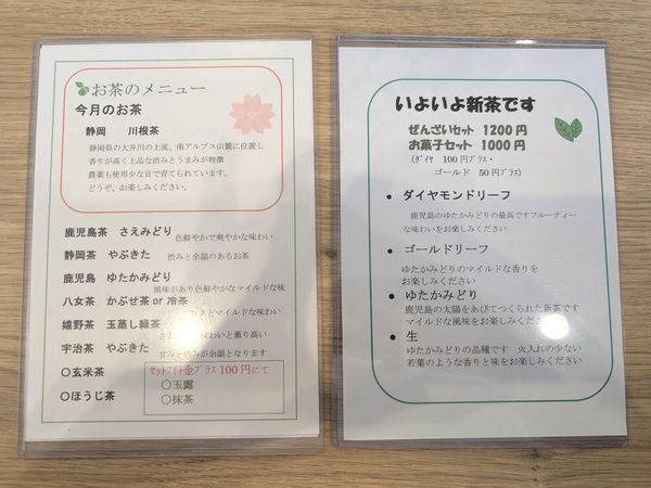 すでにテーブルにはメニューがあったので早速見てみましたが、お茶ってこんなにたくさんあるんだ!と思うほどの数が載っていて迷う迷う。日本茶インストラクターの資格を持つ店長さんがわかりやすく説明してくださり、自分の好みと思われるお茶を見つけることができました。