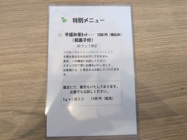 こちらは『今月のお茶』として紹介されていました。香りが高く上品な渋みが特徴。すっきりとした味わいで、私たちが普段飲む煎茶に近いかもしれません。