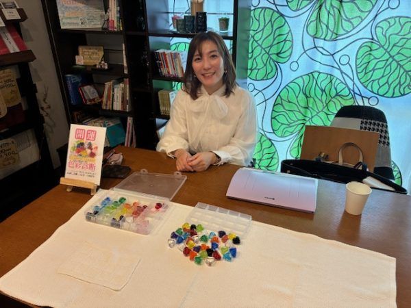 心理学に基づく色彩診断を行う愛華千絵(あいかちえ)さん。色彩診断では、自身が選択した色を通じて、言語化できないもやもや~っとした気持ちの正体を、探っていくのだそうです。ロジカルな手法なので女性だけでなく、男性も大満足の診断です。