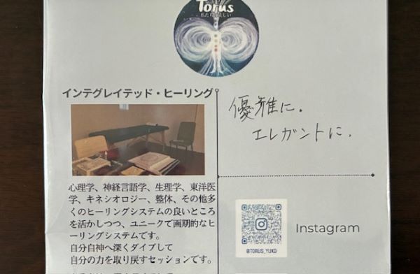 筋肉の僅かな動きから身体の状態を紐解いていくキネシオロジーを含む、様々なヒーリングシステムの良いところを活かして潜在意識へとアプローチする「インテグレイテッド・ヒーリング」を提供する「Torus_Yuko」さん。