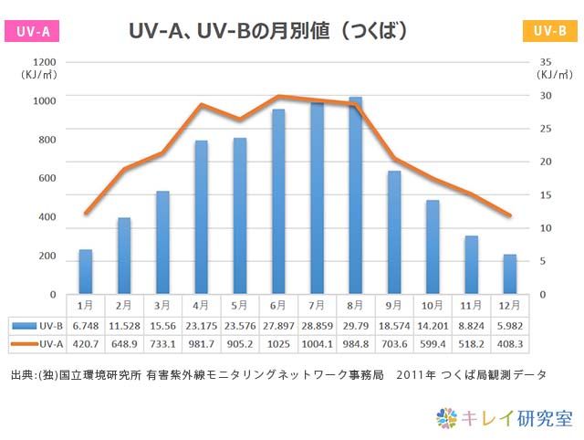 下記のグラフを見ると、紫外線のピークは5~8月にかけてではありますが、それ以外の季節でも絶えず紫外線は降り注いております。