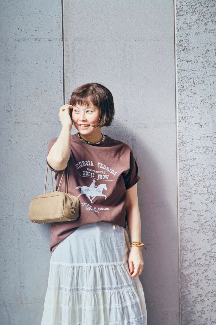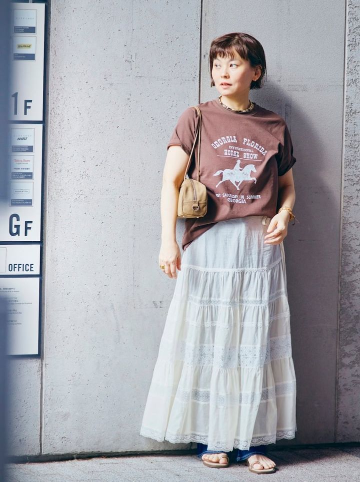 「Tシャツ+レースの鉄板スタイル。スカートの下にはデニムをレイヤードすることで、今年っぽい着こなしになるよう意識しました。ブラウン系の色味でまとめ、カジュアルながら品のあるスタイリングに」