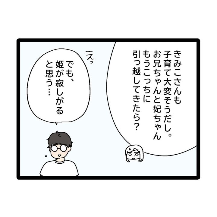 兄と妃を心配した母は「きみこさんも子育て大変そうだし。お兄ちゃんと妃ちゃんもうこっちに引っ越してきたら?」と提案しました。兄は「えっでも、姫が寂しがると思う・・・」と悩んでいる様子。