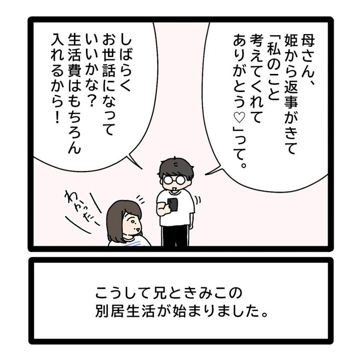 兄がきみこに聞いてみると・・・「私のこと考えてくれてありがとう!」と言っていたようで、兄はしばらく実家に住むことに決めました。この日から兄ときみこの別居生活が始まりました。