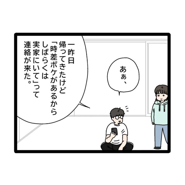 兄と妃がうちで過ごし始めて3週間が経とうとしていた頃、兄にきみこがいつ帰ってきるのか聞いてみました。すると「あぁ、一昨日帰ってきたけど『時差ボケがあるからしばらくは実家にいて』って連絡がきた」と言われました。