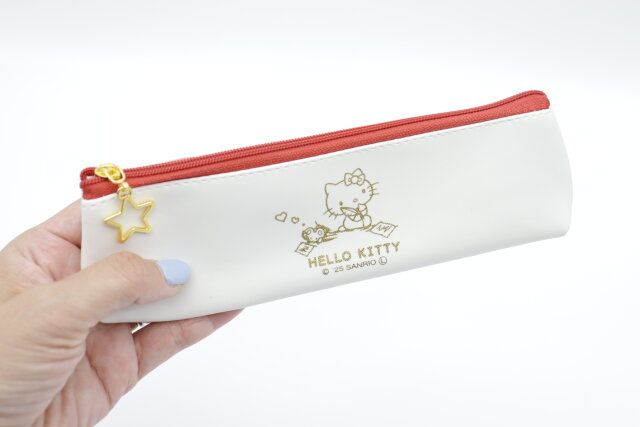 白い合皮×ゴールドのファスナー、キティちゃんのテーマカラーの赤がアクセントになっていて、デザインが秀逸!
