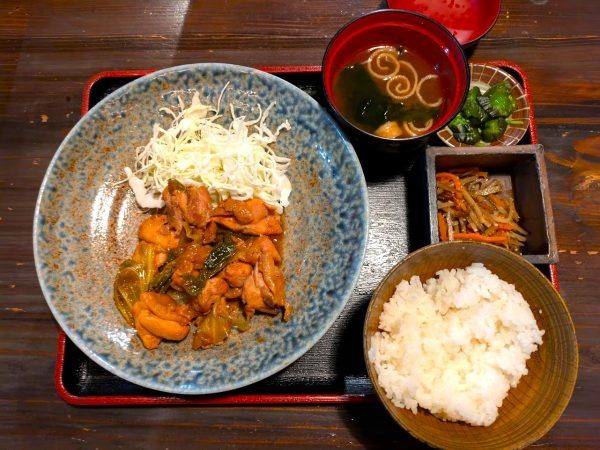 日替わり定食は、メインの鶏料理に小鉢・漬物・赤出汁・ご飯で800円