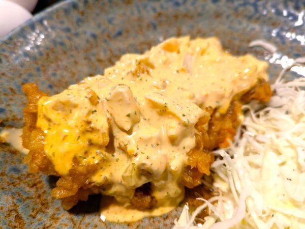 チキン南蛮のチキンと玉子タルタルソースがおいしいです。チキンの衣がカリッとしていて、鶏肉が柔らかくてジューシーです。なにより、この玉子タルタルソースの玉子が大きいのが嬉しいですね。白身がザクザクです。マヨネーズと半熟卵黄が溶けていい色になっています。