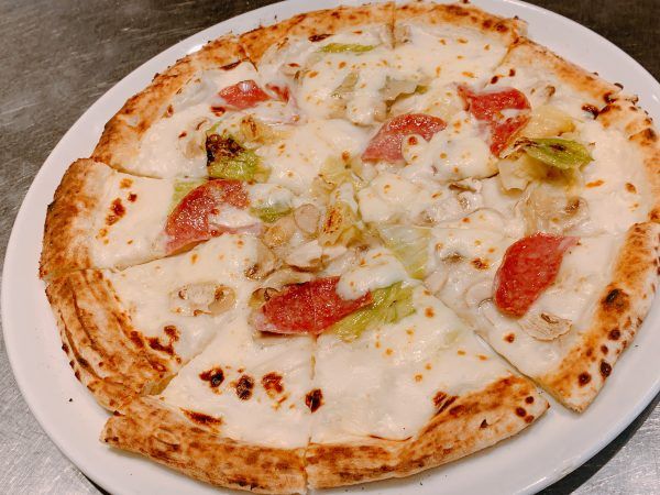 「気まぐれピッツァ」の完成! 焼き立てをいただくと…とろーりチーズが熱々で、具材たっぷりのとても美味しいピッツァでした!