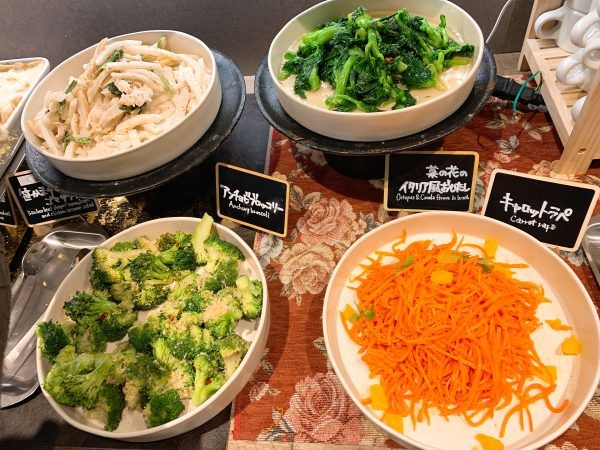 前菜コーナーには、春らしい「菜の花のイタリア風おひたし」や仙台名物・笹かまを使った「笹かまチキンゴマサラダ」のほか、「キャロットラペ」「アンチョビブロッコリー」。