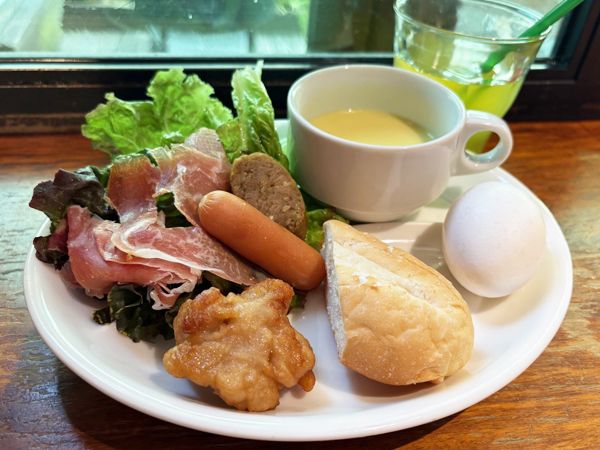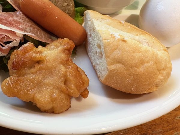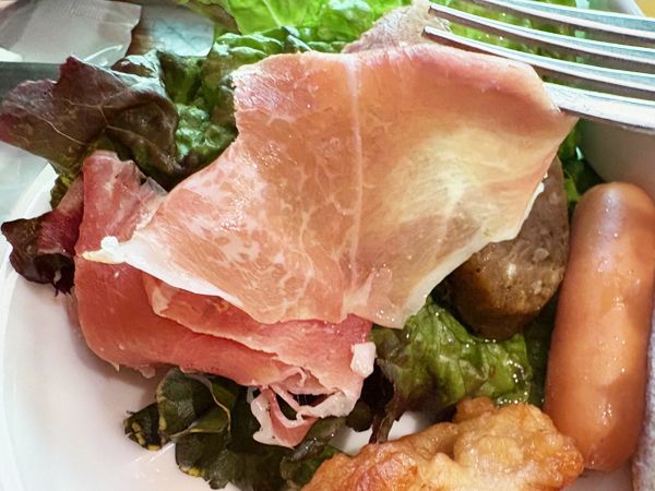 その日のビュッフェの内容は、サラダ、パン、ソーセージ、からあげ、ゆで卵、そして生ハム。ソーセージはウインナーとハーブソーセージの2種がありました。