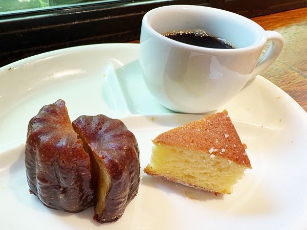 最後は、カヌレとケーキ、コーヒーでデザートタイム。ケーキはしっとり甘い味わい。カヌレは、モチッとした食感とカラメルの風味がいい味わい。甘いスイーツとコーヒーで、朝食の満足度がかなり高くなりました。