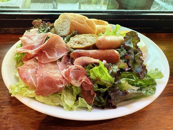 ひと通り味わったら、次はこんな感じで盛りつけました。プレートに仕切りがあるのですが、気にせずサラダをどっさり。生ハム、ソーセージ、を並べてパンを添えます。