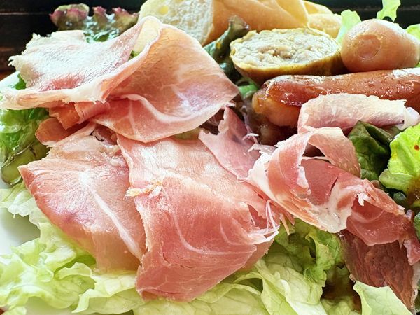 気になる生ハムは、薄くスライスしてあるものの、しっかりとした塩気が生ハムのうまみを引き立てています。ハーブソーセージはそのハーブの風味がアクセントになって、ほかの食材を引き立てています。