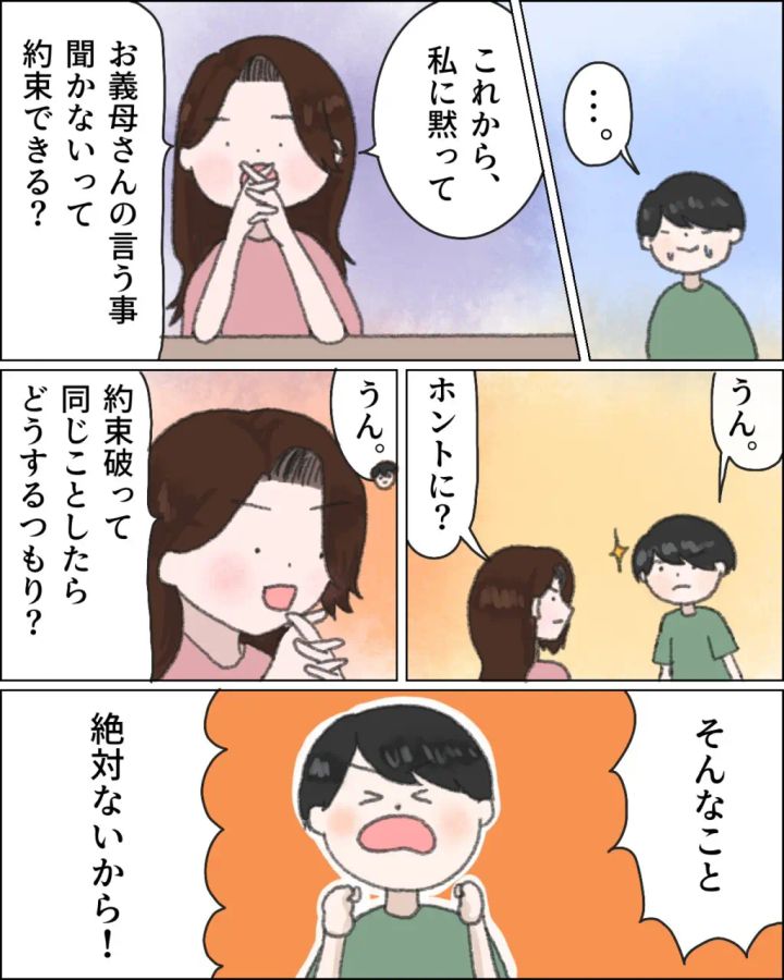 私に信用できないと言われた良太は、自分でも自信がないのか黙ってしまいました。私は良太の目を真っすぐ見て、「これから、私に黙ってお義母さんの言う事聞かないって約束できる?」と聞きました。キリッとした顔で「うん」と即答した良太に「ホントに?」と念押し。それでも「うん」と答えた良太に「約束破って同じことしたらどうするつもり?」と聞くと、「そんなこと絶対ないから!」と力強く叫んだ良太。