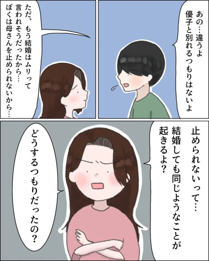 母親に結婚を反対されたら良太さんが自分と別れるつもりだったのだと思った優子さんはショックを隠し切れず「ごめん。ちょっと時間ちょうだい」と言い、「このまま結婚してもいいのかな」と結婚に迷いが出てきた優子さん。良太さんは「優子と別れるつもりはないよ」と言ってくれましたが、「ぼくは母さんを止められないから・・」と頼りない言葉。最初から諦めモードの良太さんに「結婚しても同じようなことが起きるよ?どうするつもりだったの?」と優子さんが厳しく追及すると「結婚したらさすがに別れろとは言ってこないかなって」と楽観的な良太さん。「ぼく、ちゃんと守るから」と意気込みを見せる良太さんの言葉を全く信用できない優子さんは「これから私に黙ってお義母さんの言う事聞かないって約束できる?」と確認し、「うん」と力強く答えた良太さんに「じゃ、それを証明してみせて」と言って、今すぐに義母に電話をしてプラン変更の件を断るように良太さんに詰め寄りました。