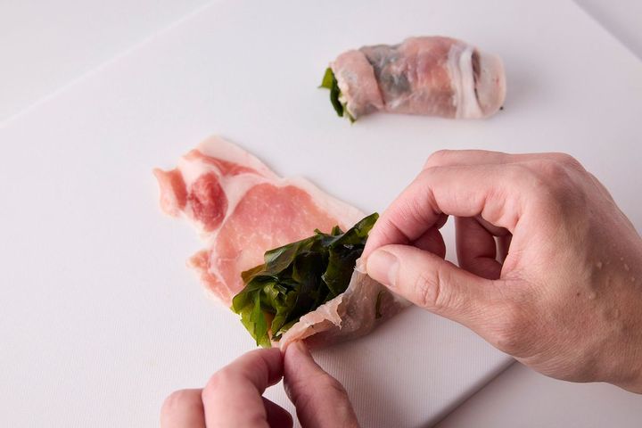 わかめは水でもどし、水けをしっかりと拭く。豚肉を縦長に置き、手前にわかめを1/8 量ずつのせ、手前から巻く。